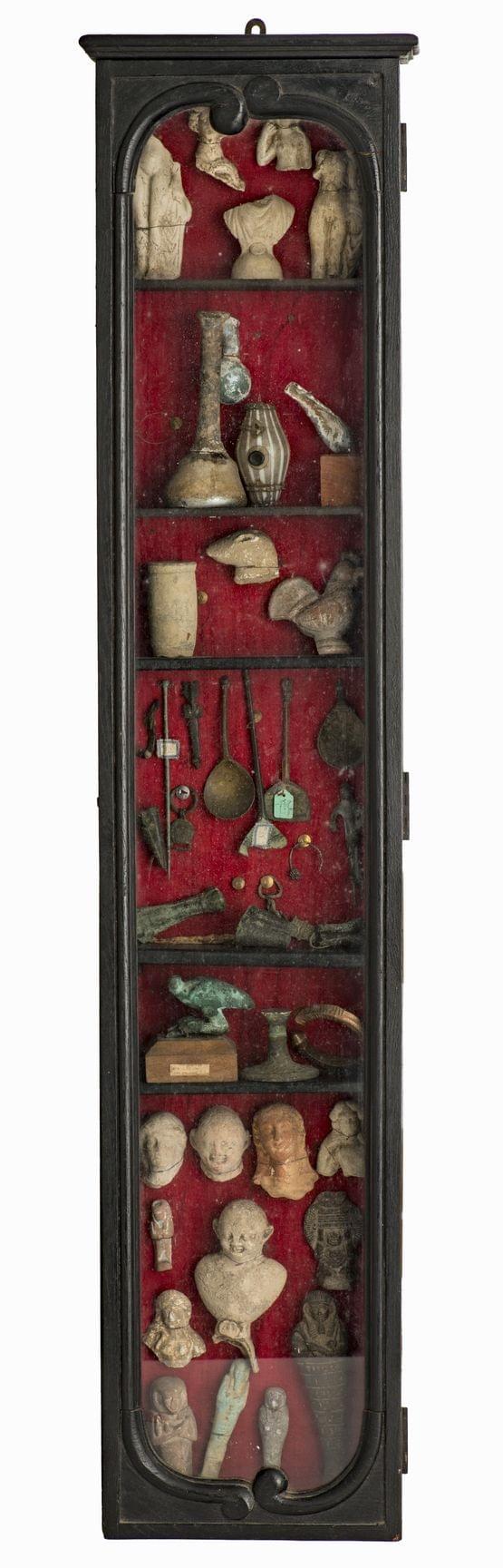 Contenant divers objet archéologiques des civilisations grecque, égyptienne et romaine, 110x25x10 cm