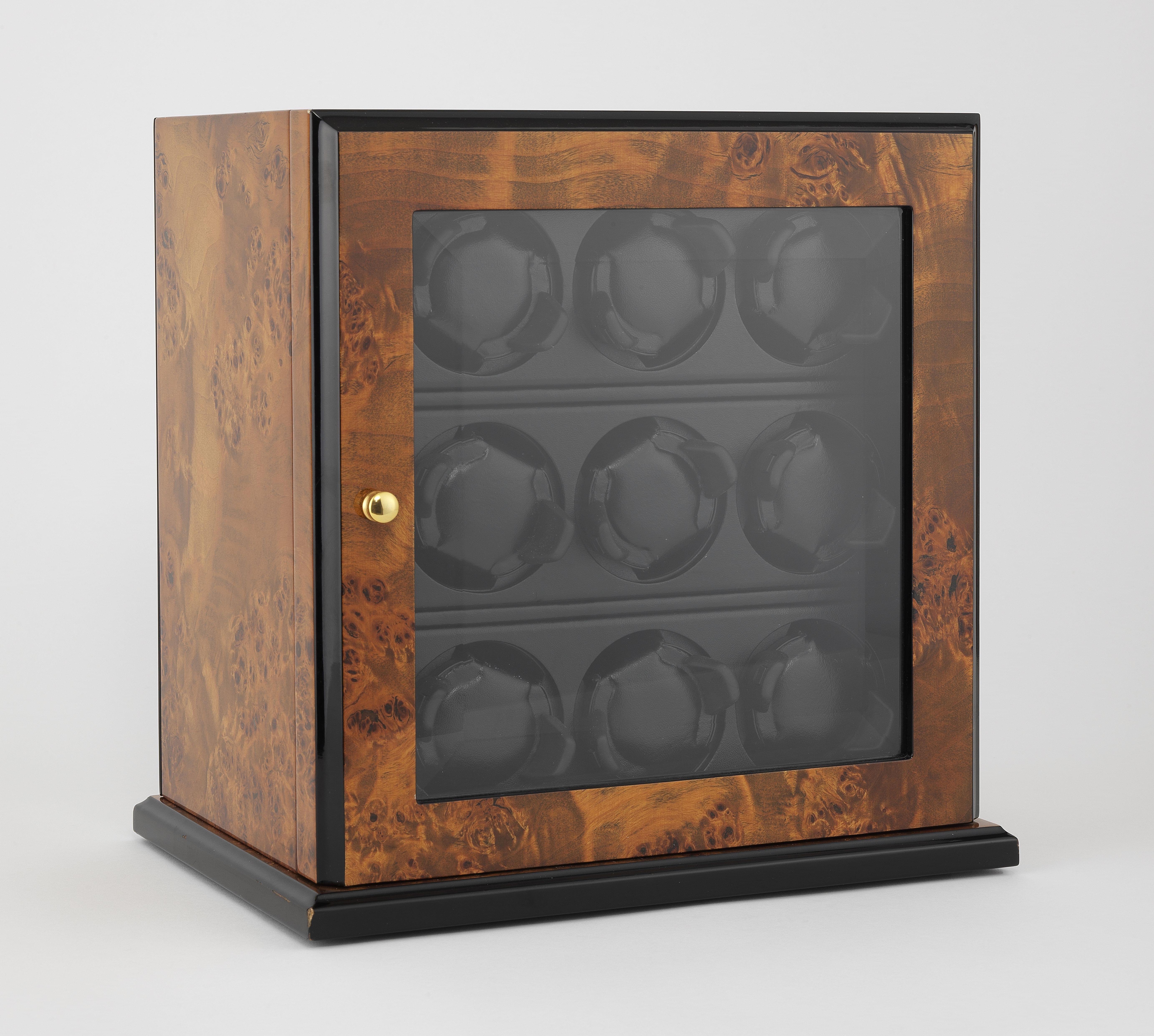 Neuf emplacements rotatifs, éclairage à piles, bois de loupe vernis, 31x29x21 cm