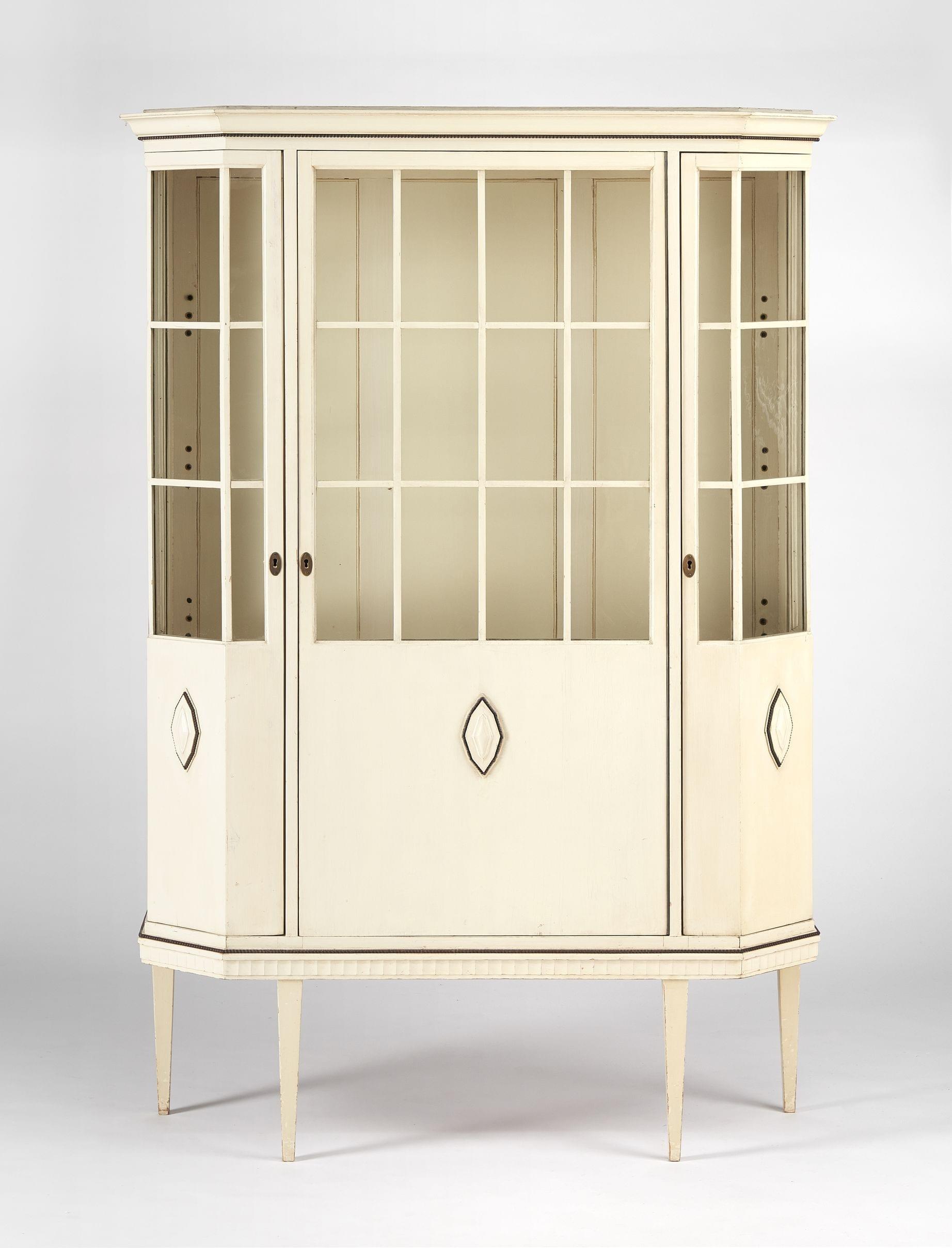 Bois laqué blanc et brun, pans coupés et motifs géométriques appliqués, 170x117x39 cm