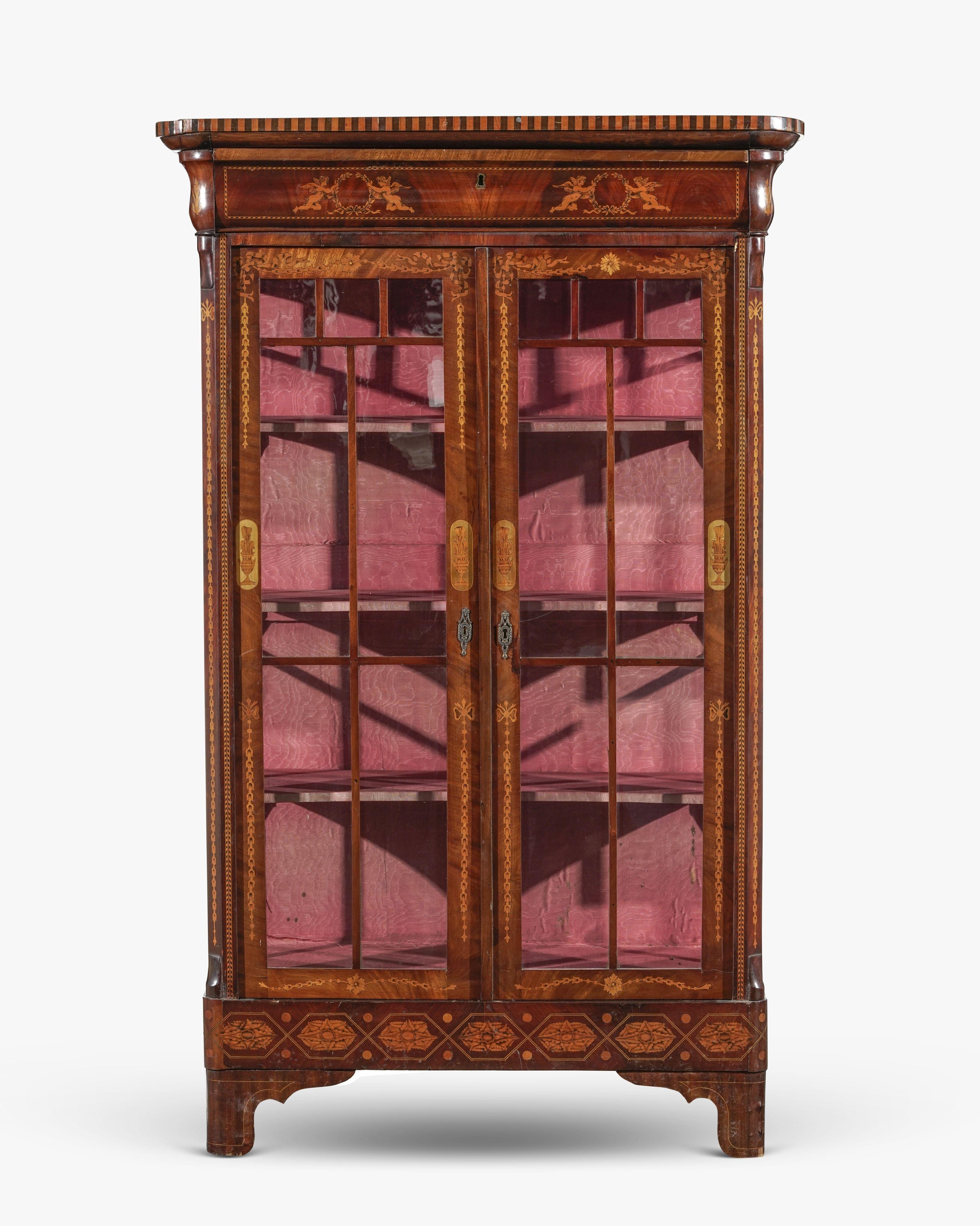 Acajou à décor marqueté de bois clair, d'angelots, rinceaux et vases, deux vantaux vitrés, 167x103x46 cm