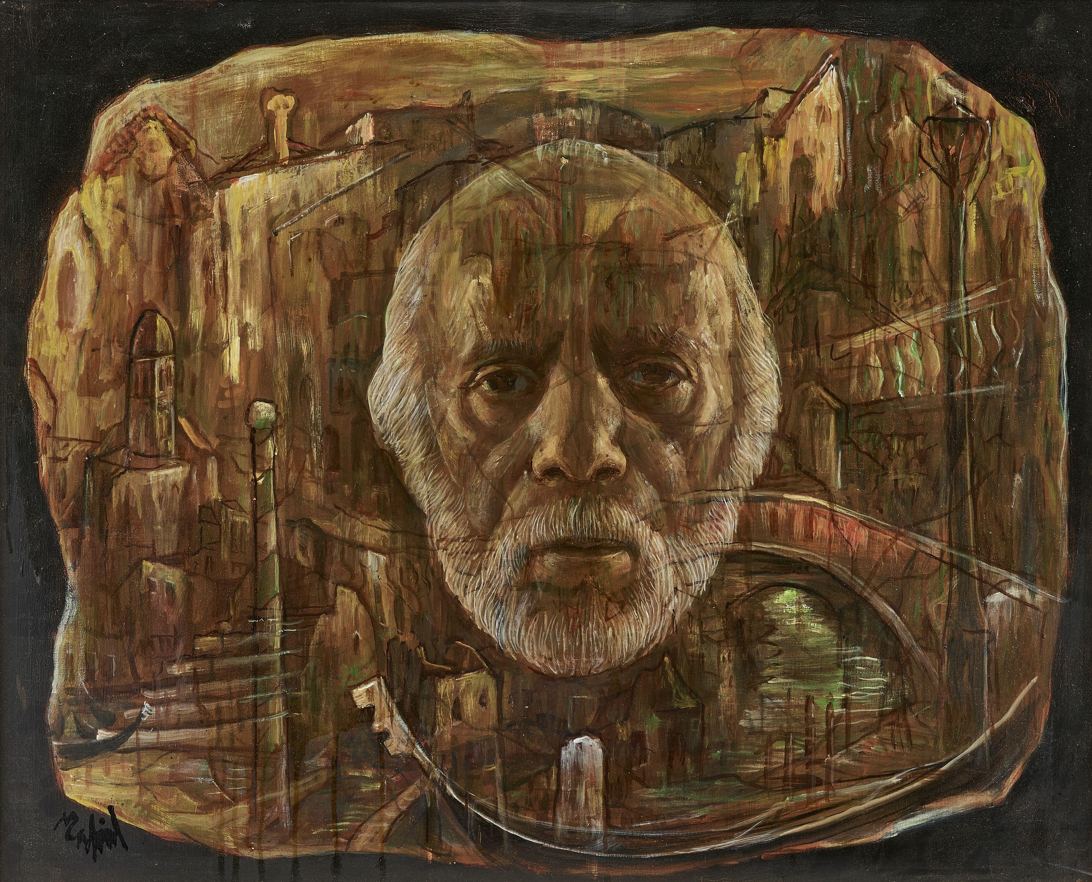 Visage sur fond de Venise, huile sur toile, signée, 60x73 cm
