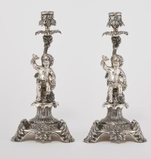 505. Paire de candélabres à décor de Bacchus enfant et pampres de vig...