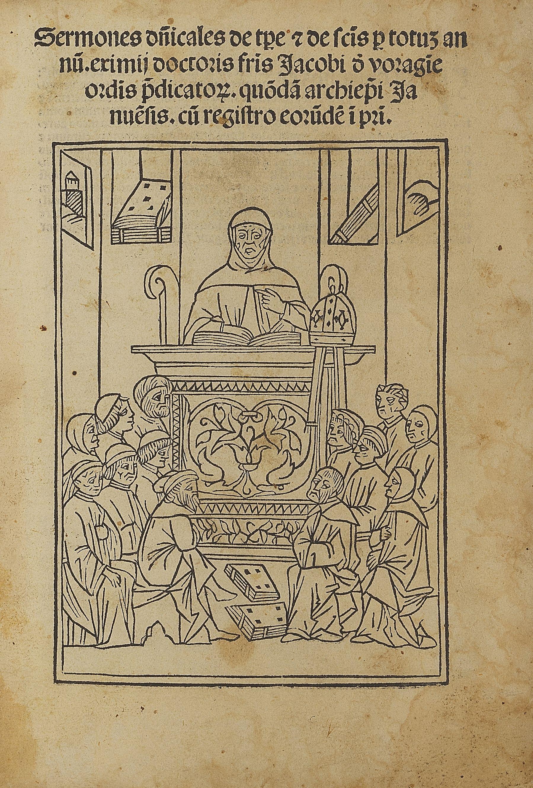 In 8°, vélin postérieur. Belle édition, le titre est orné d’une grande vignette gravée sur bois au trait simple, représentant Jacques de Voragine, de l’ordre des Frères Prêcheurs, en chaire, en train de prêcher à ses frères. (petites brunissures, galerie minime de vers sur les trois derniers ff,).