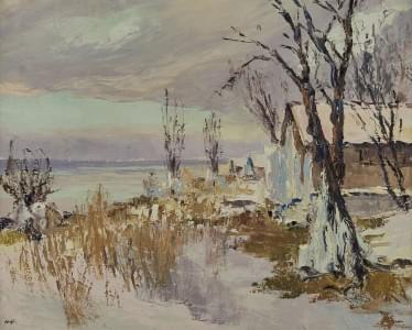 Paysage hivernal au bord du lac, huile sur toile signée, 50x60 c...