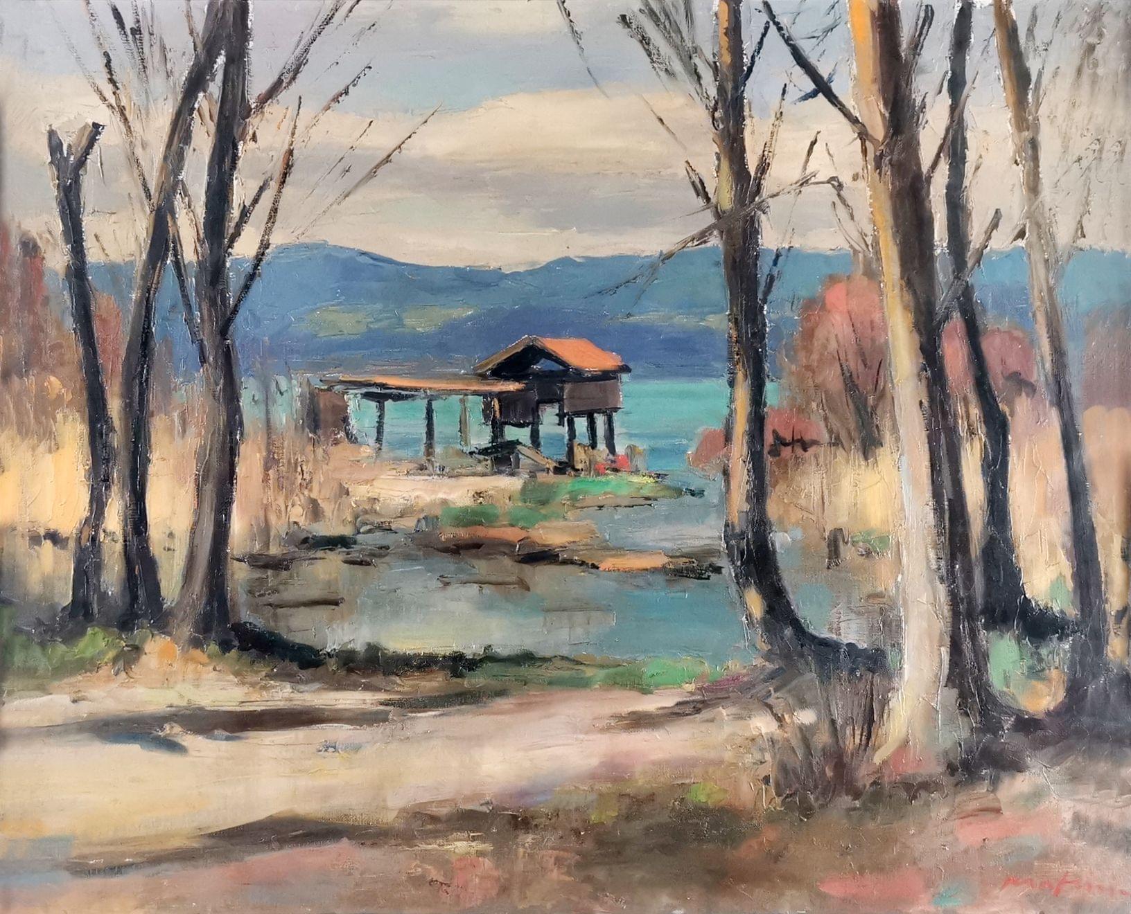 Coucher de soleil, huile sur toile, signée et datée 1974, 54x54...