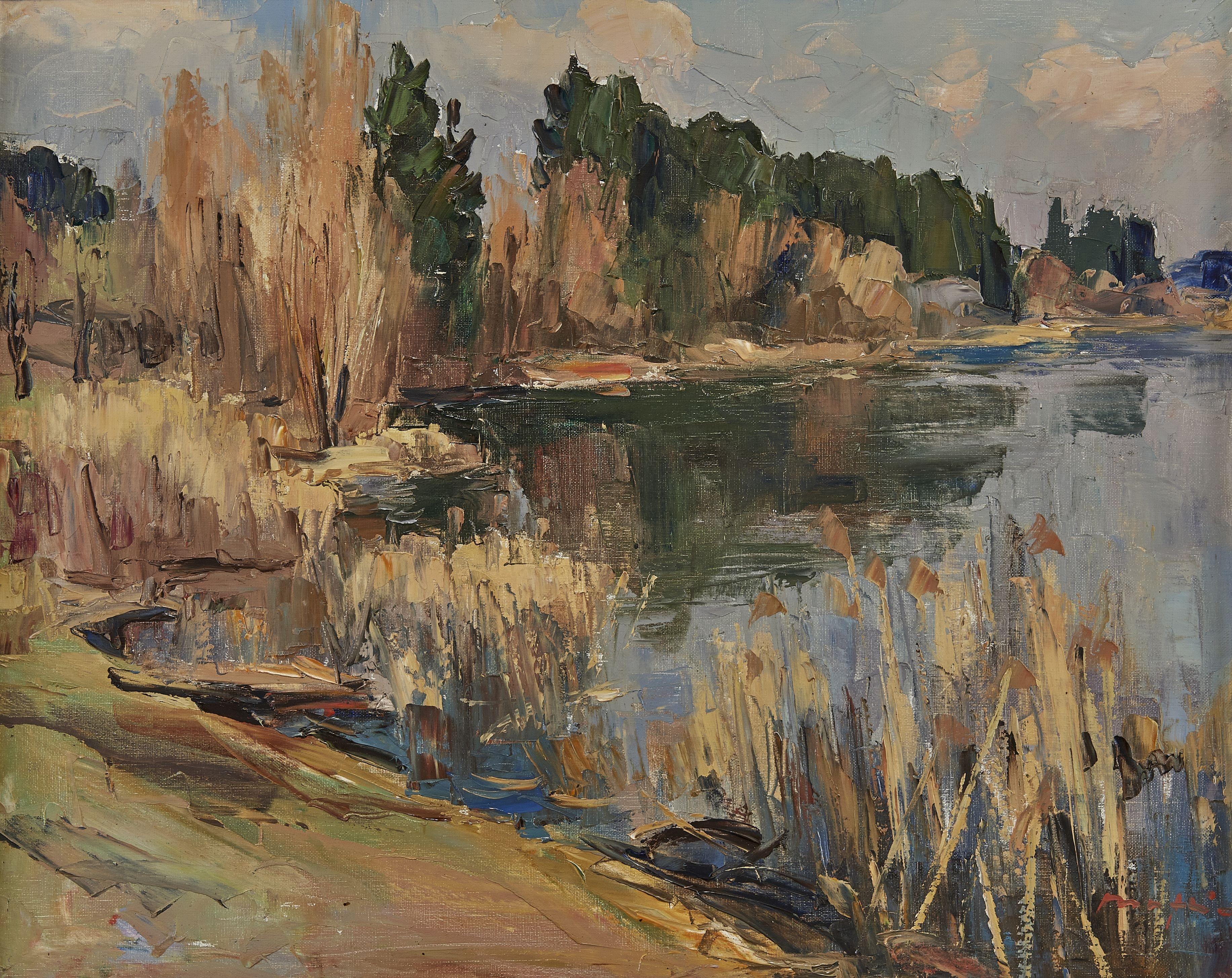 Paysage hivernal au bord du lac, huile sur toile signée, 50x60 c...