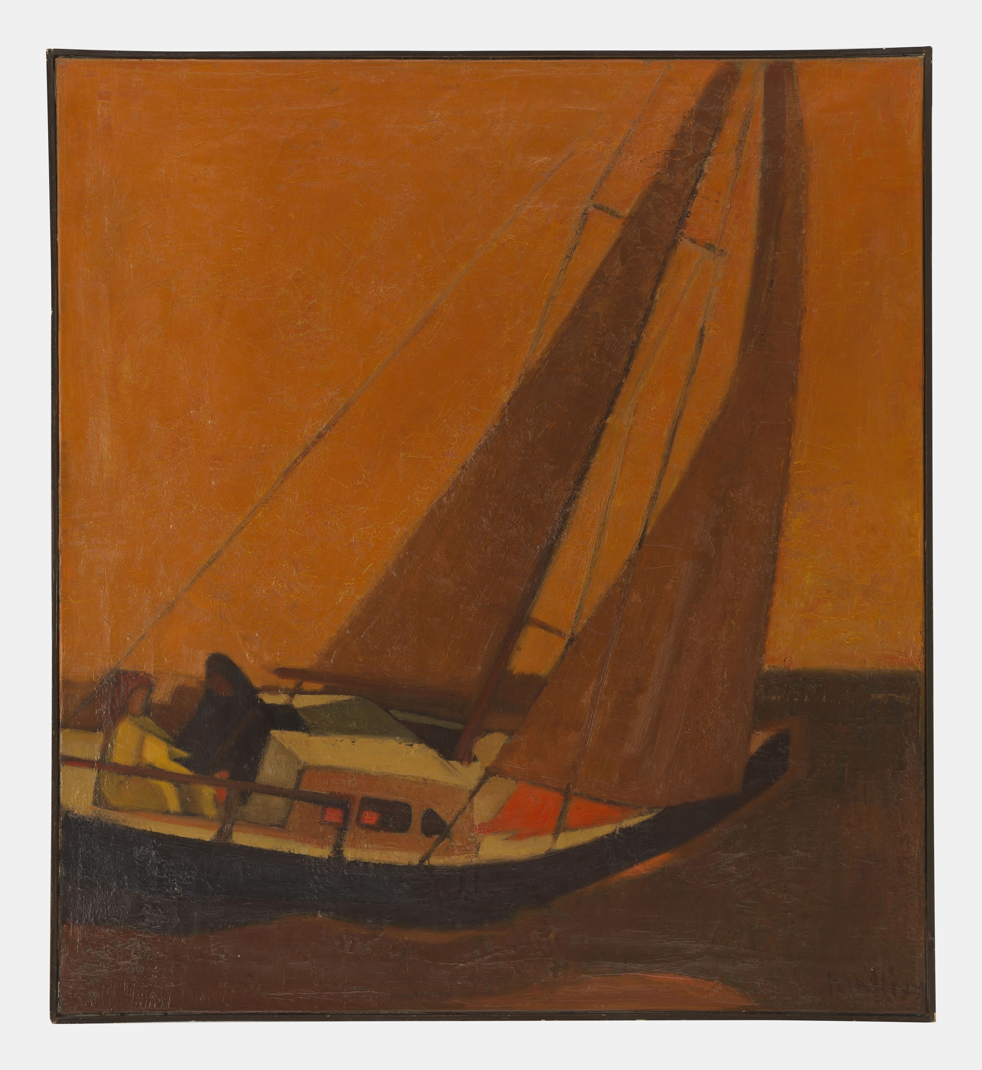 Barques sur le lac de Bret, craie grasse sur papier, signée et d...