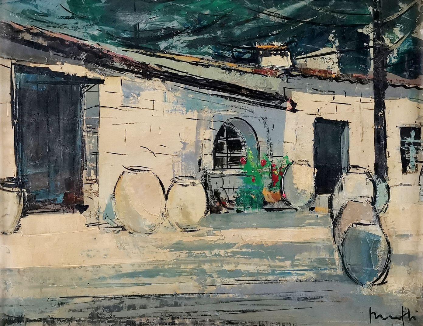 Coucher de soleil, huile sur toile, signée et datée 1974, 54x54...