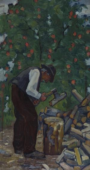 Vieux bûcherons, paire d'huiles sur bois signées 1912 et 1914, situées Vuilly, 28,5x14,5 cm