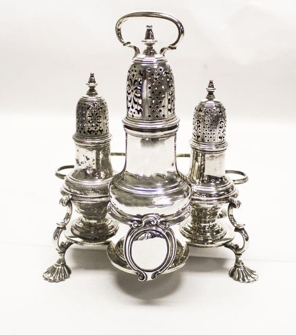 90. Paire de saupoudroirs, deux bouteilles et un flacon en verre gra...