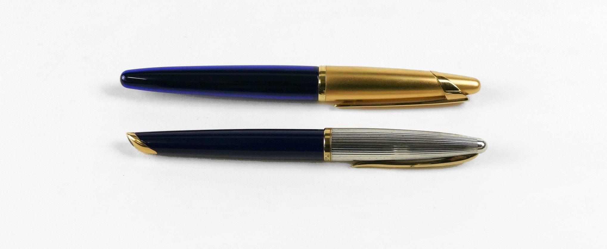 Résine bleue, métal et métal doré, plumes M en or 750, L 14,5 et 15 cm