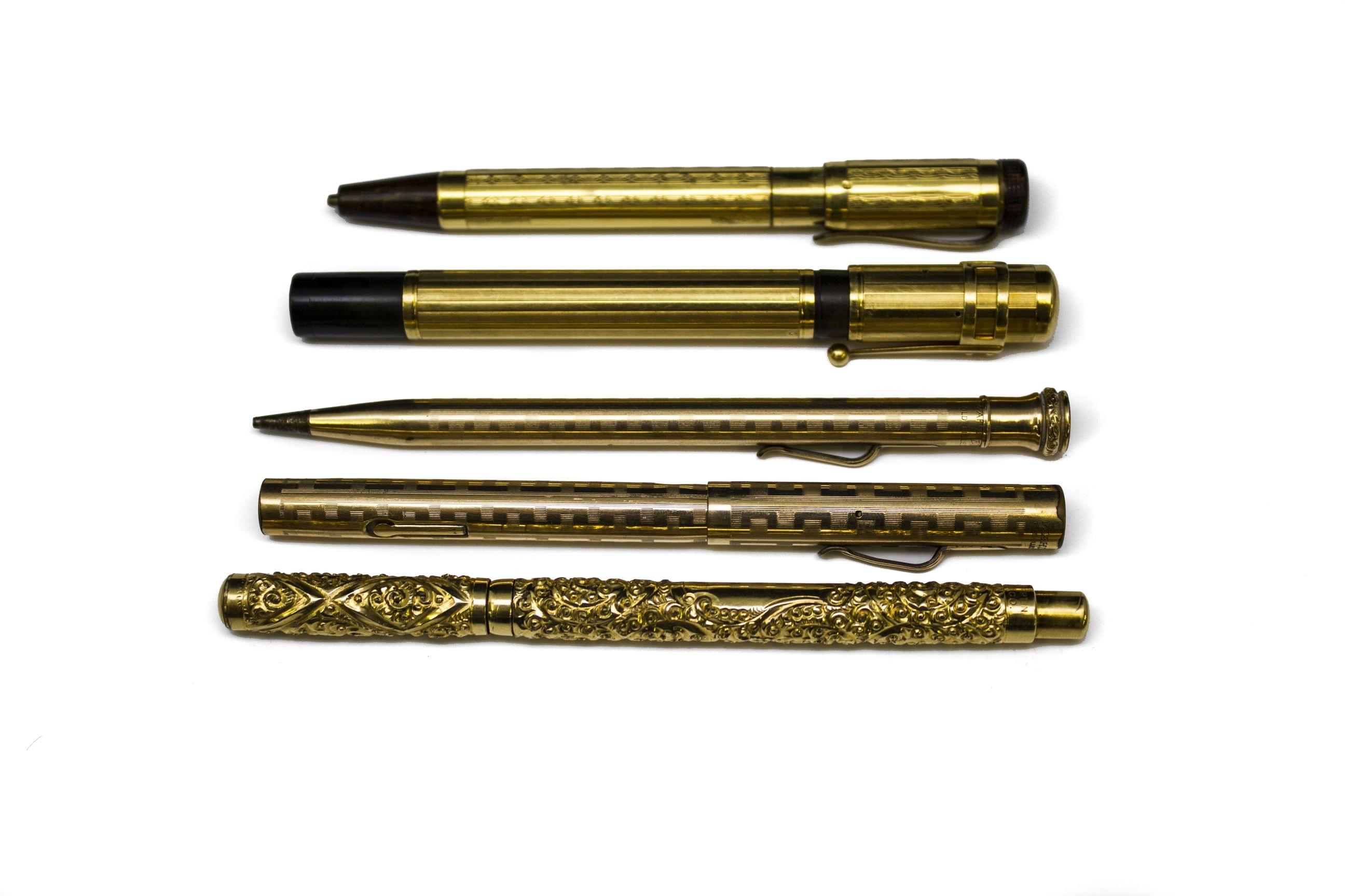 Or 750, poids brut 28 g, dans un écrin ancien. On joint trois écrins contenant des stylos en métal doré.