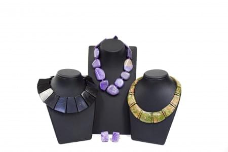3138. Lot de trois colliers d'unakite, de jaspe violet et de bois