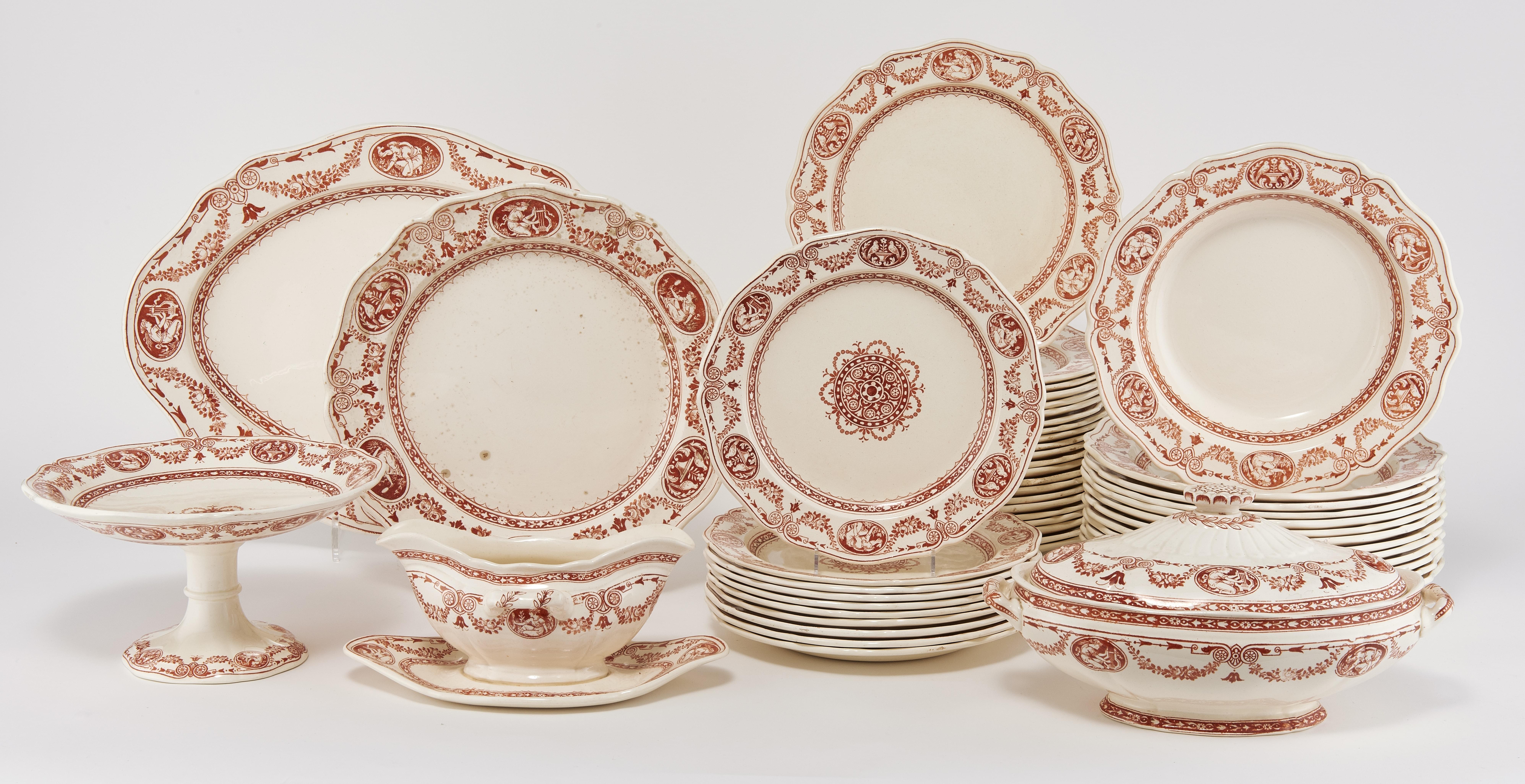 3413. Wedgwood, service à dîner à motif néoclassique de médaillons et guirlandes rouges, faïence, comprenant: 24 assiettes à dîner, 24 à dessert, 12 creuses, 10 pièces de service