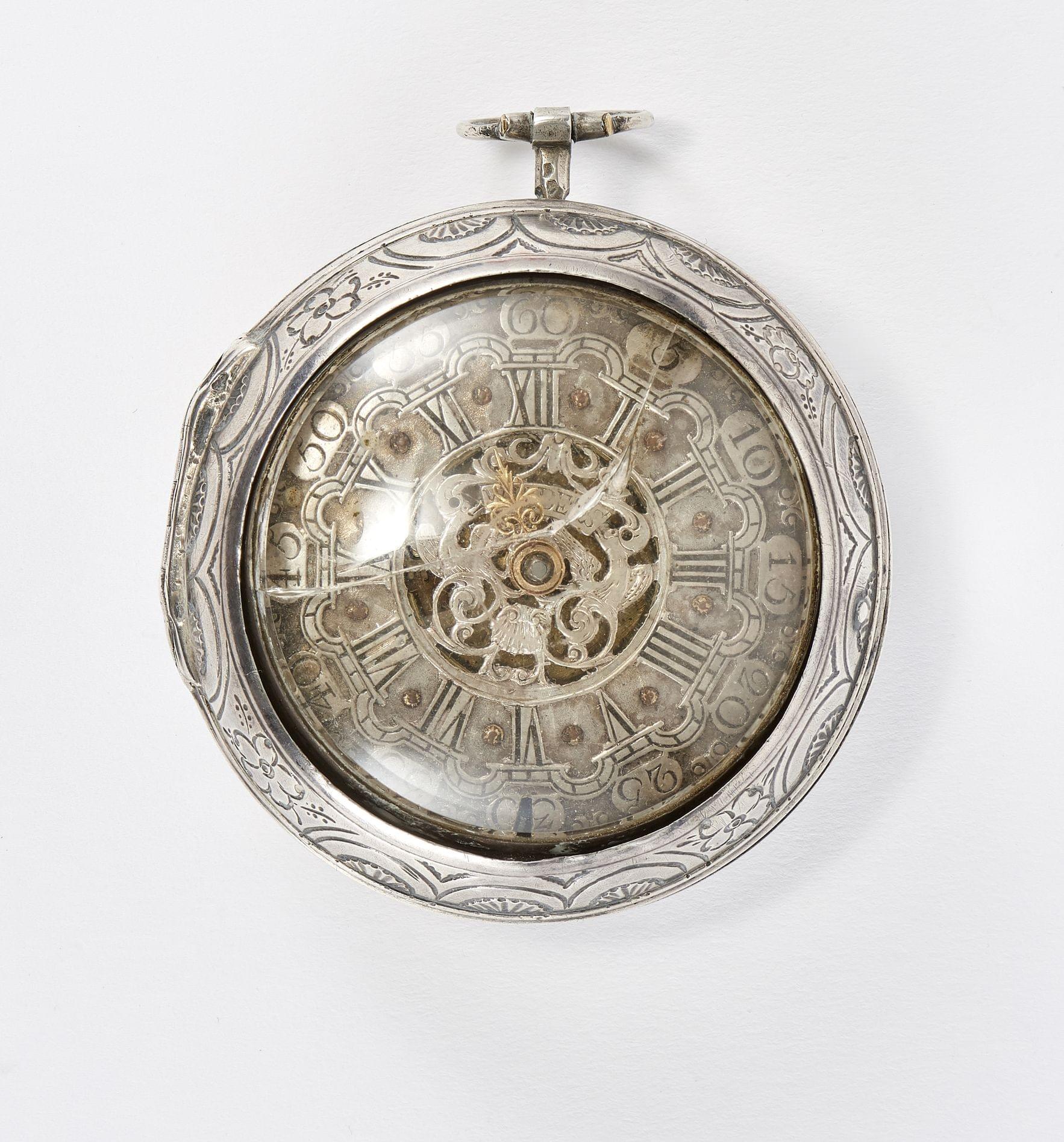 Cadran gris ajouré à décor de phénix, chiffres romains noirs en serlienne, Londres, dans son double boîtier à décor de scène mythologique, argent, D 5 cm