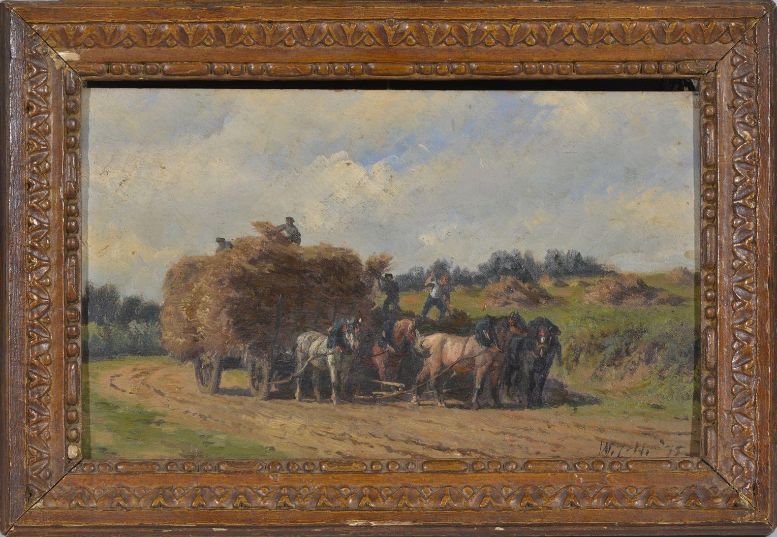 Charrette de foin, huile sur panneau monogrammée et datée 75, 20x33 cm