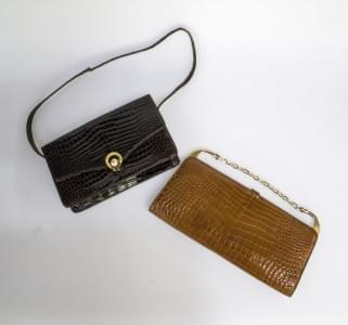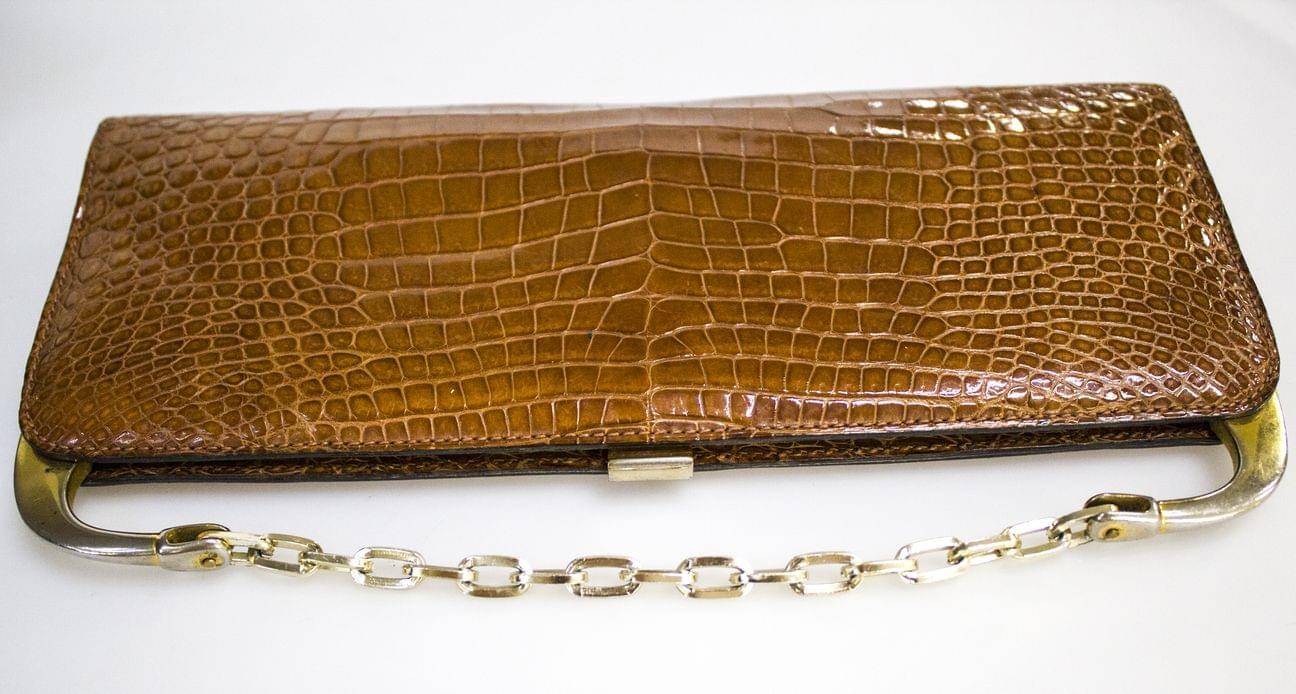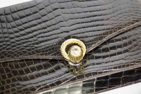 Sac en crocodile marron, fermeture à rabas avec garniture dorée, 24x14cm. On joint une pochette en crocodile camel