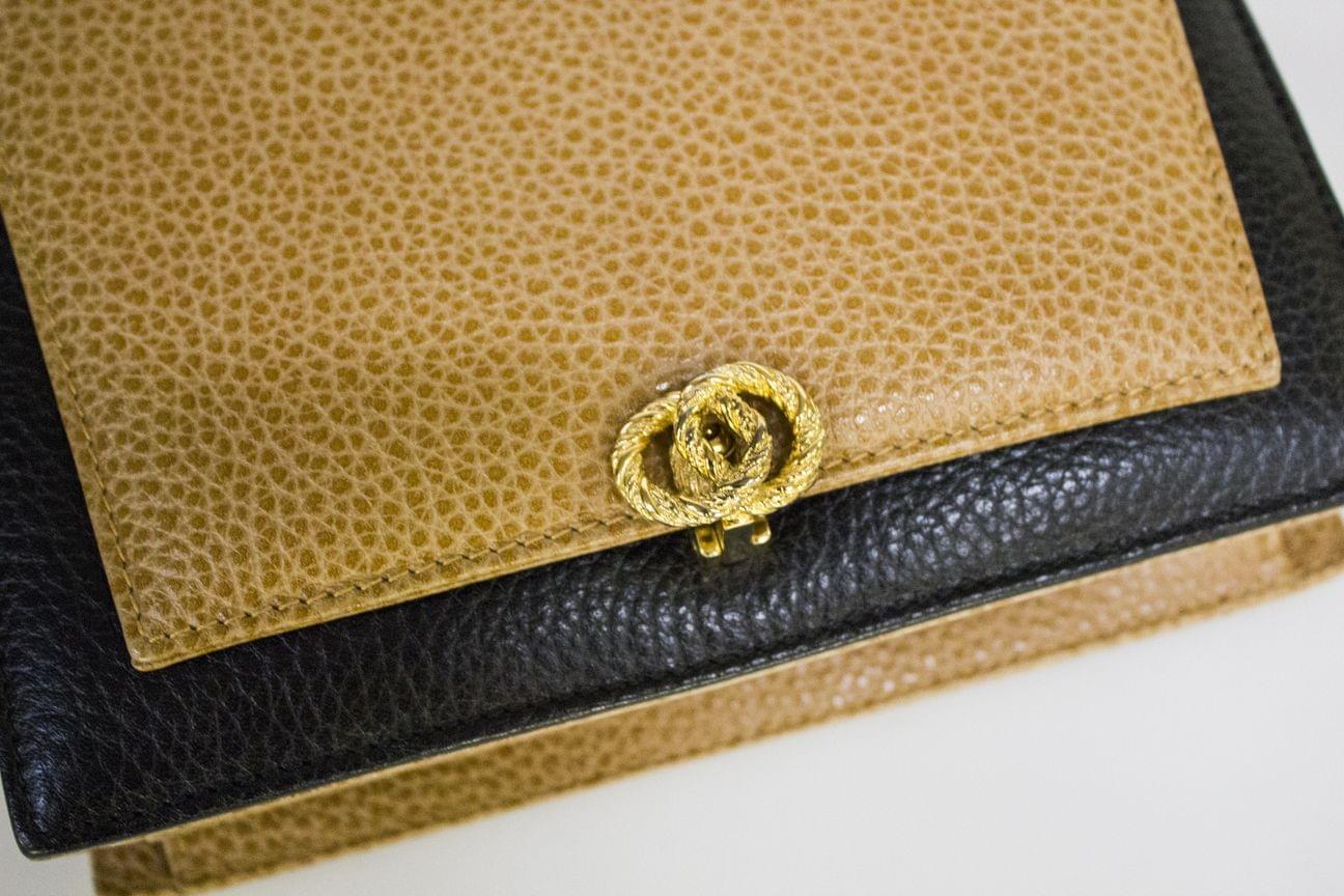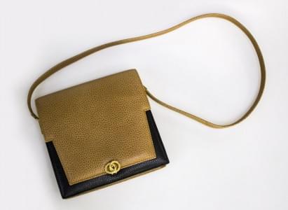 Sac en cuir grainé beige et noir, fermeture à rabas avec garniture dorée, 20x19cm