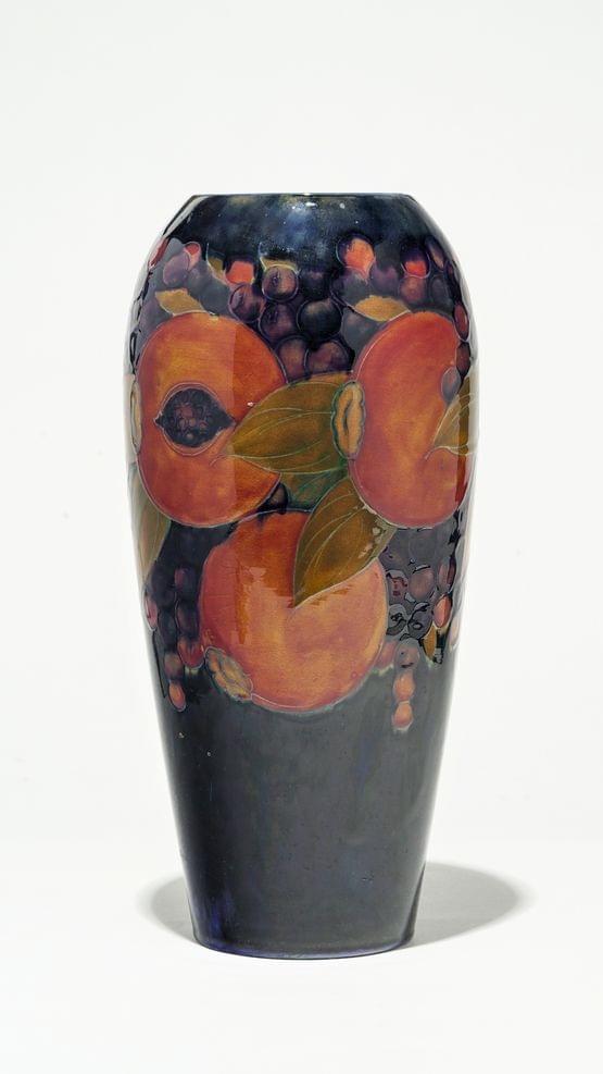 Vase balustre, céramique à décor de fleurs orange sur fond noir, H 32 cm