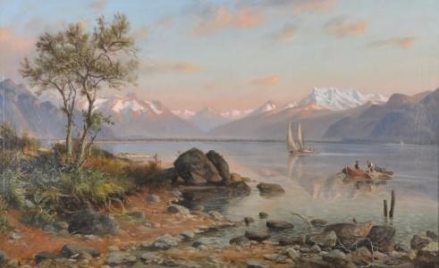 Vue du lac avec les Dents du midi, huile sur toile, monogrammée...