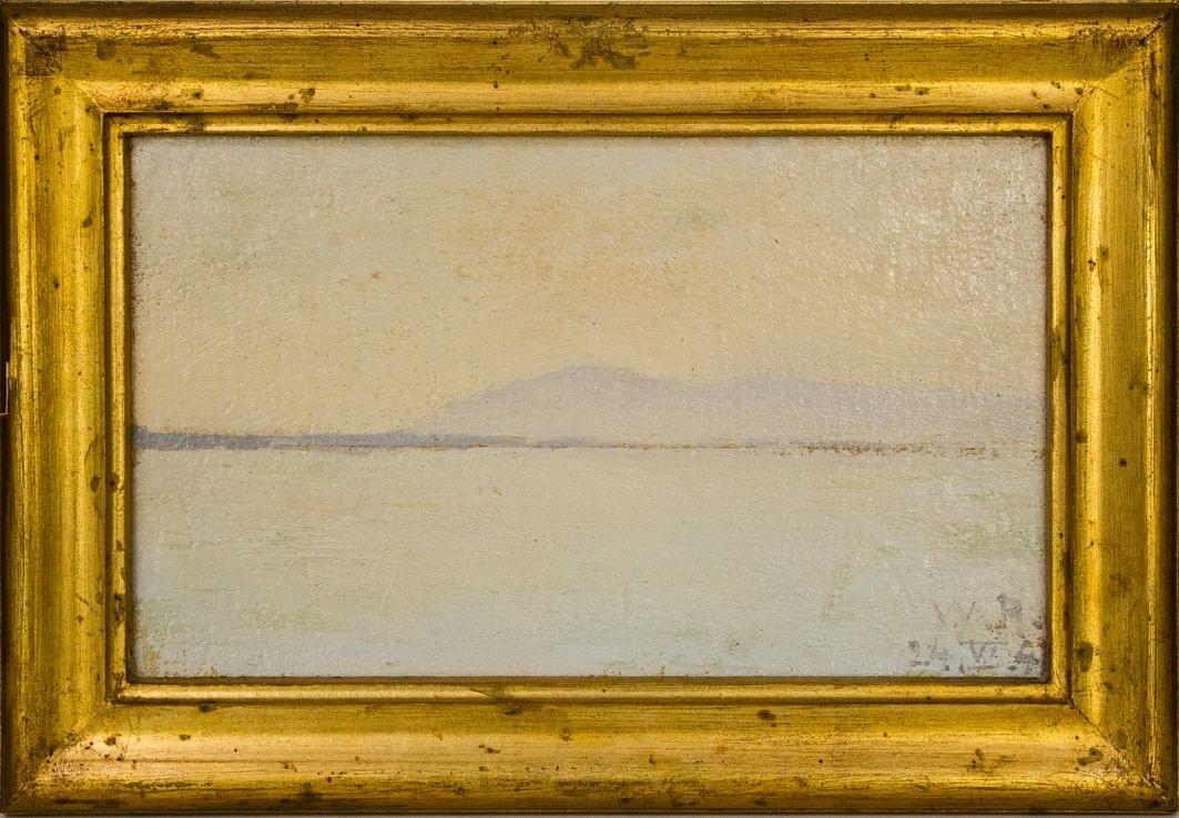 Le lac de Neuchâtel le matin, huile sur carton, monogrammé et daté 41, 13x22 cm