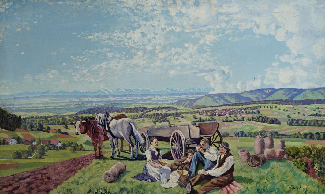 Pause des paysans sur la plaine, huile sur panneau, signée, 60x100 cm