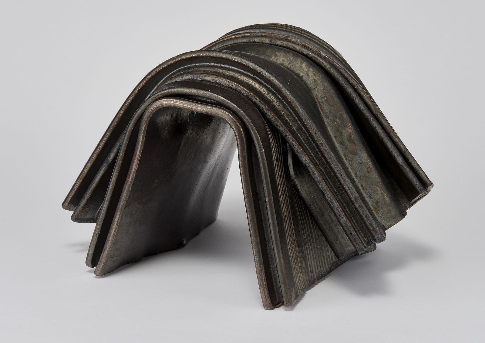 Tôle profilée pliée, céramique à patine métallique, signée, H 30,5 cm