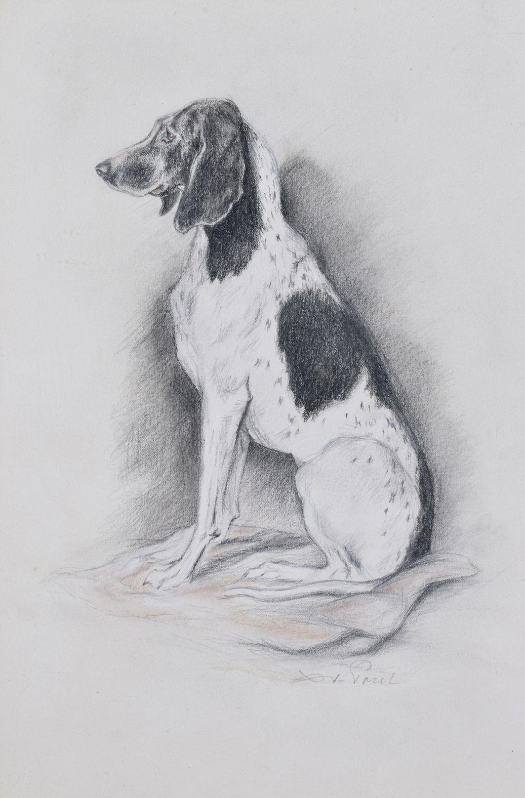 Chien de chasse assis, crayon gras, mine de plomb et sanguine sur papier, signé, 31x20 cm