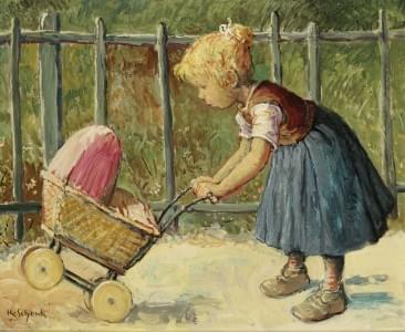 Jeune fille à la poussette, huile sur pavatex, 45x55 cm