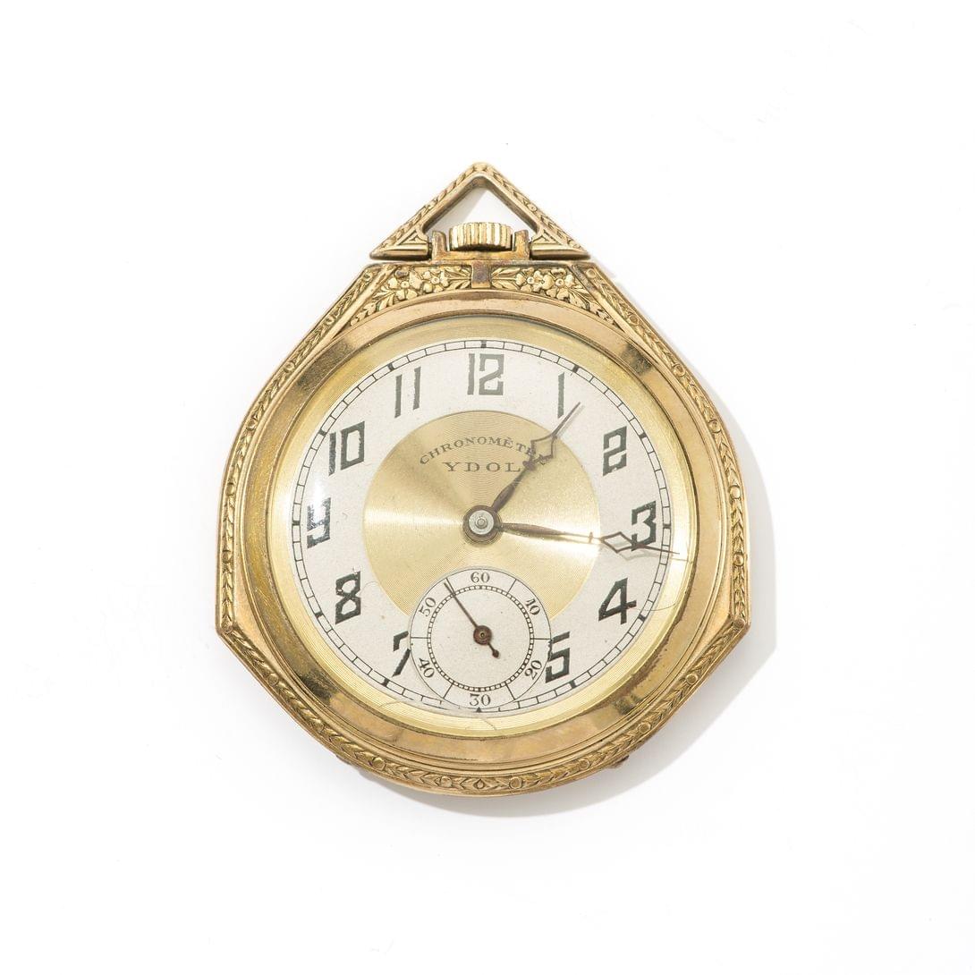 Cadran doré et crème, chiffres arabes et aguilles noirs, secondes à 6h, plaquée or, D 45 mm