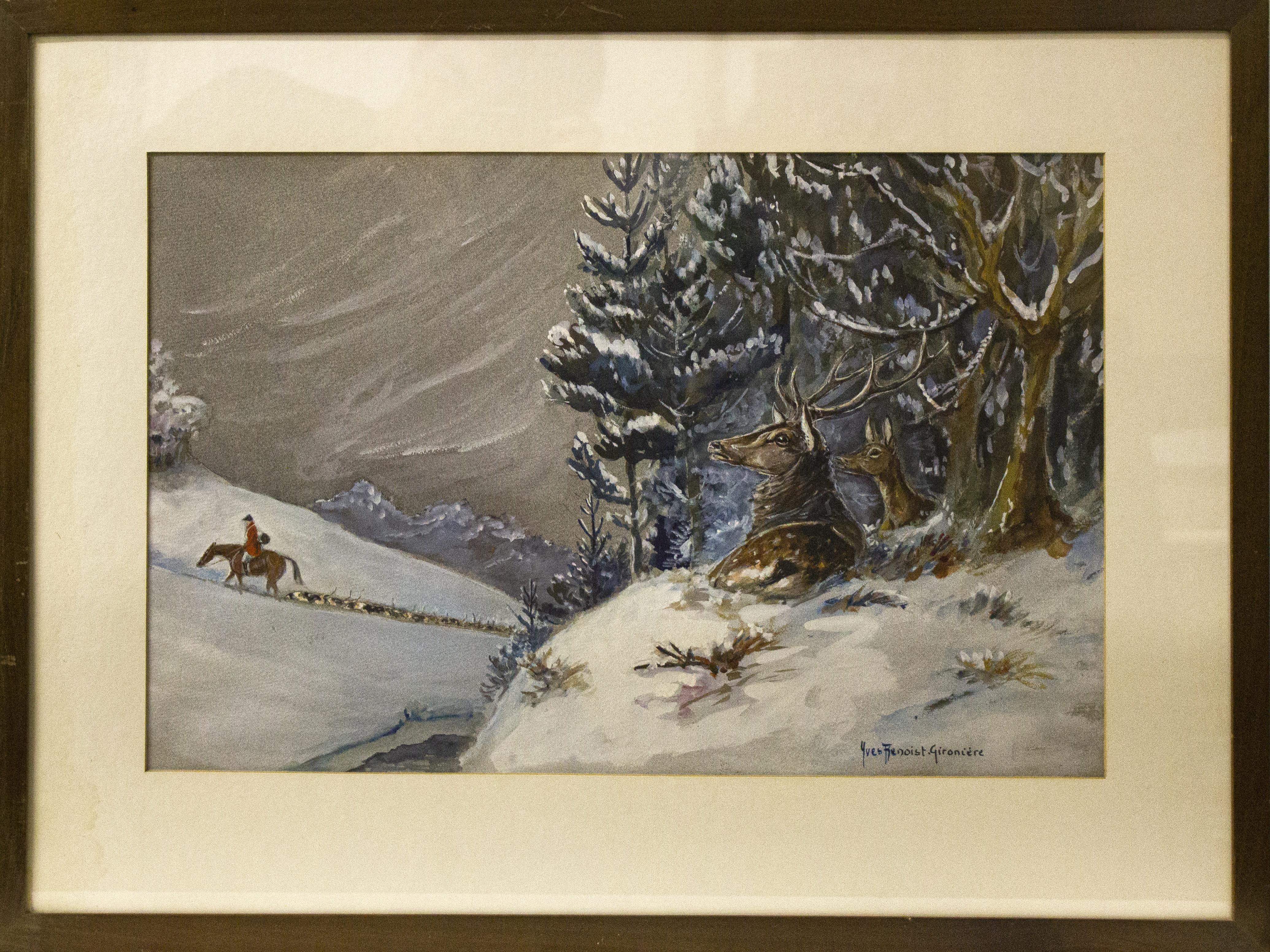 Scène de venerie hivernale, aquarelle sur papier, signée, 31x48 cm