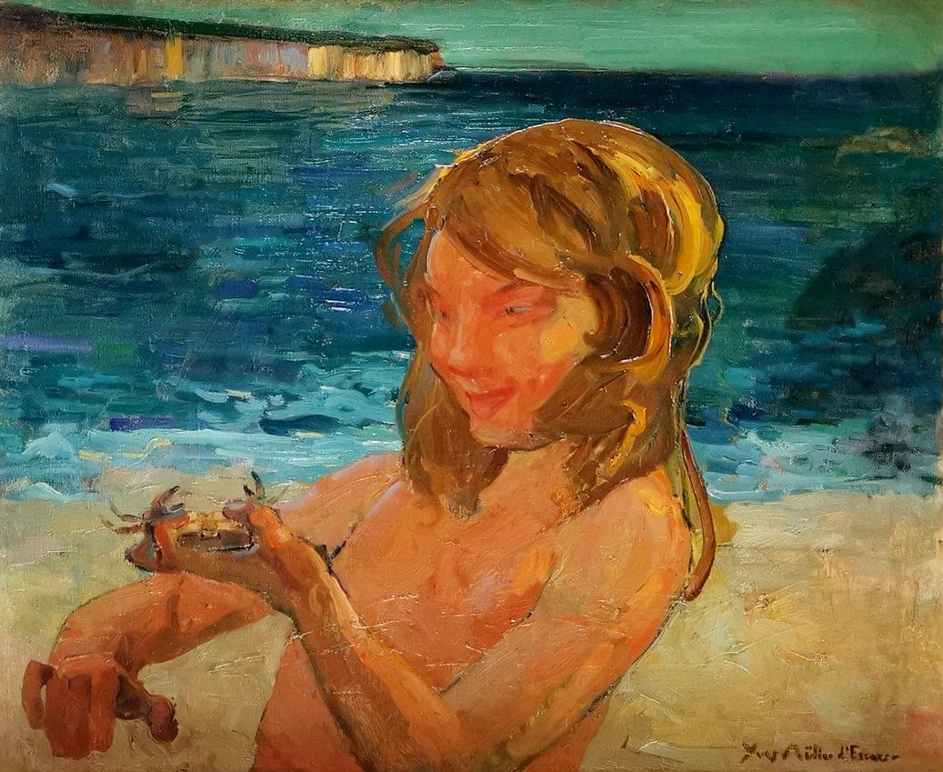 Jeune fille au crabe, huile sur toile, signée, 50x60 cm