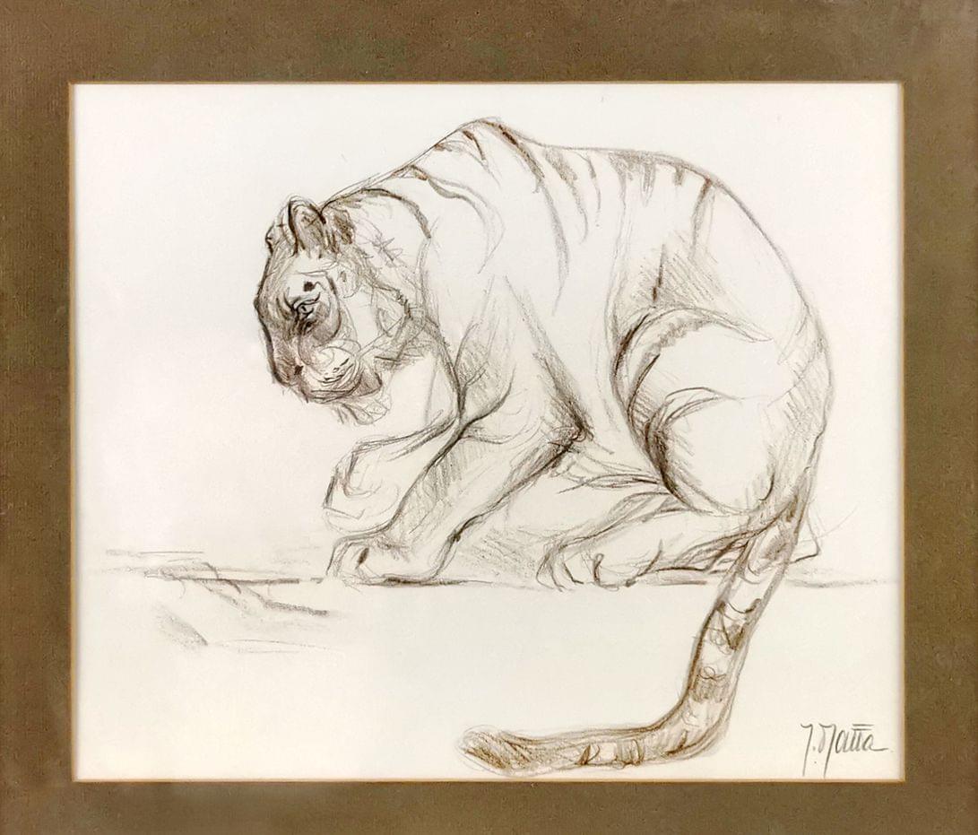 Tigre guettant, cirque Knie, fusain sur papier, signé, 27x32 cm