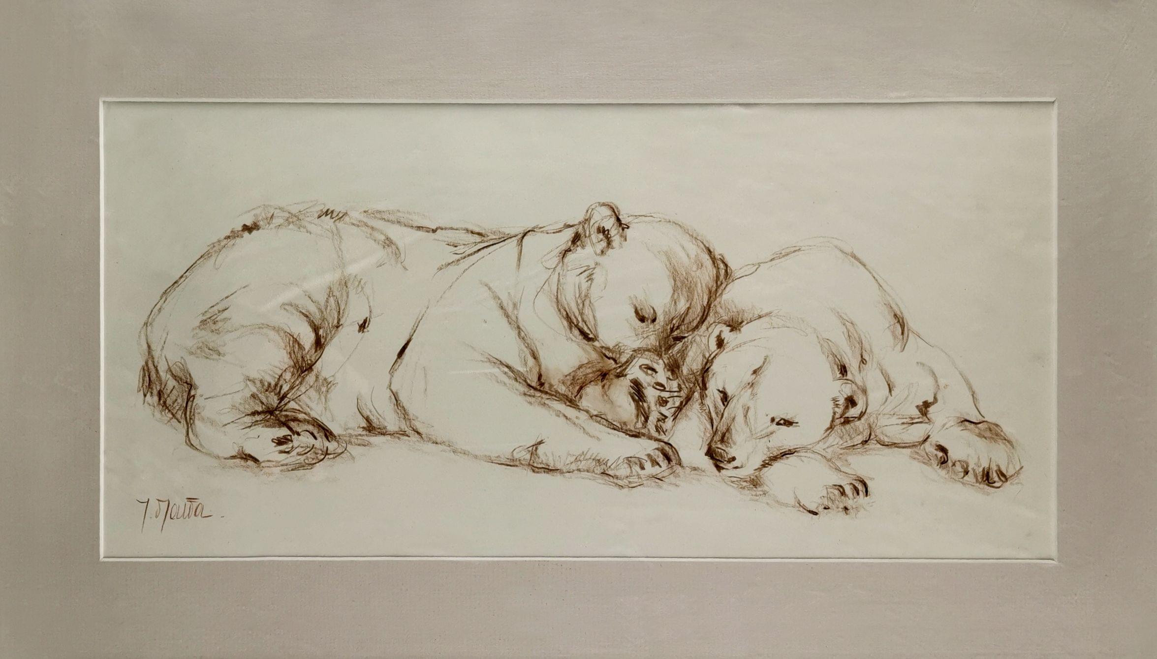 Les ours polaires, fusain sur papier, signé, 21x45 cm