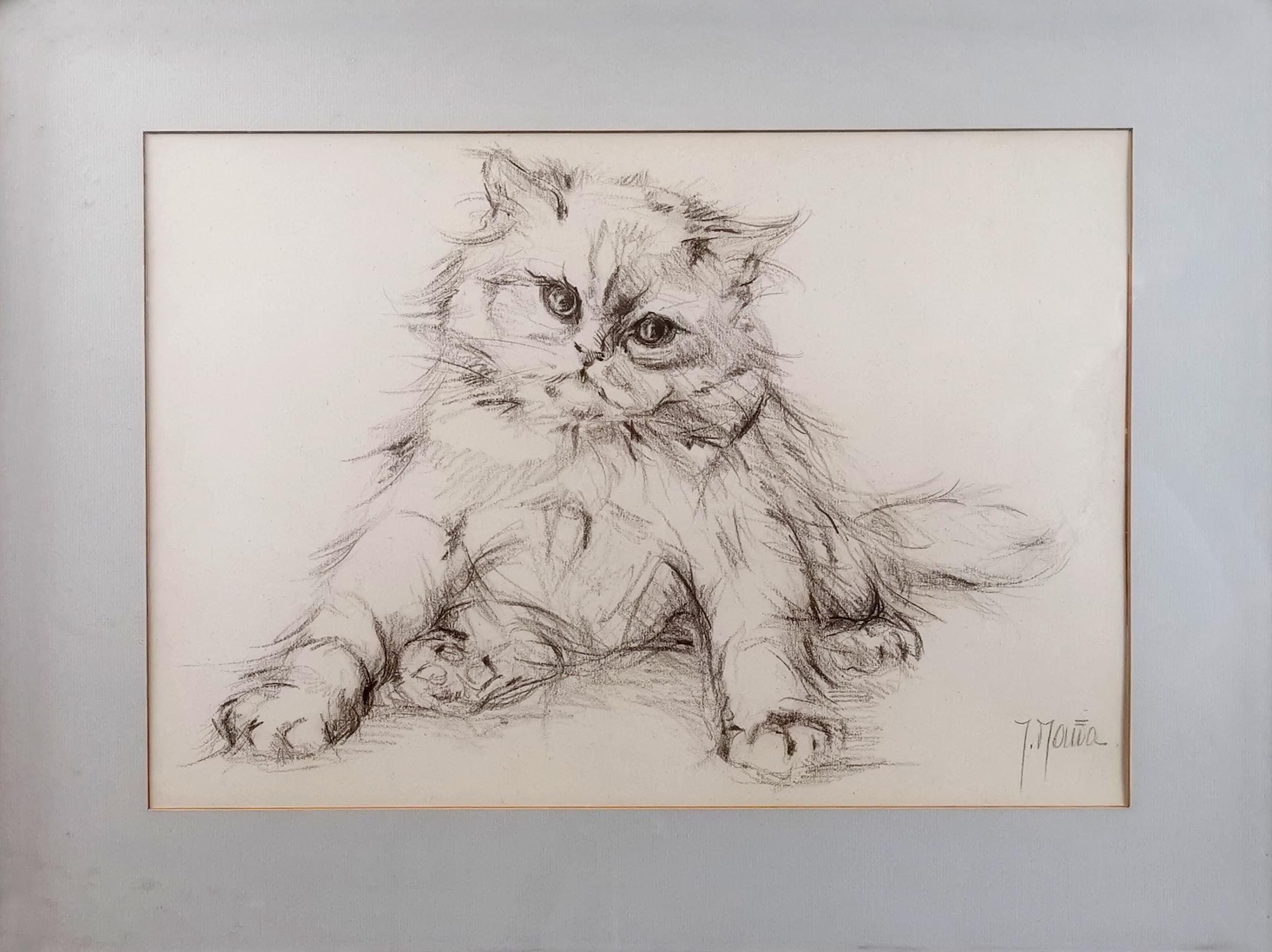 Jeune chat persan, fusain sur papier, signé, 29x42 cm