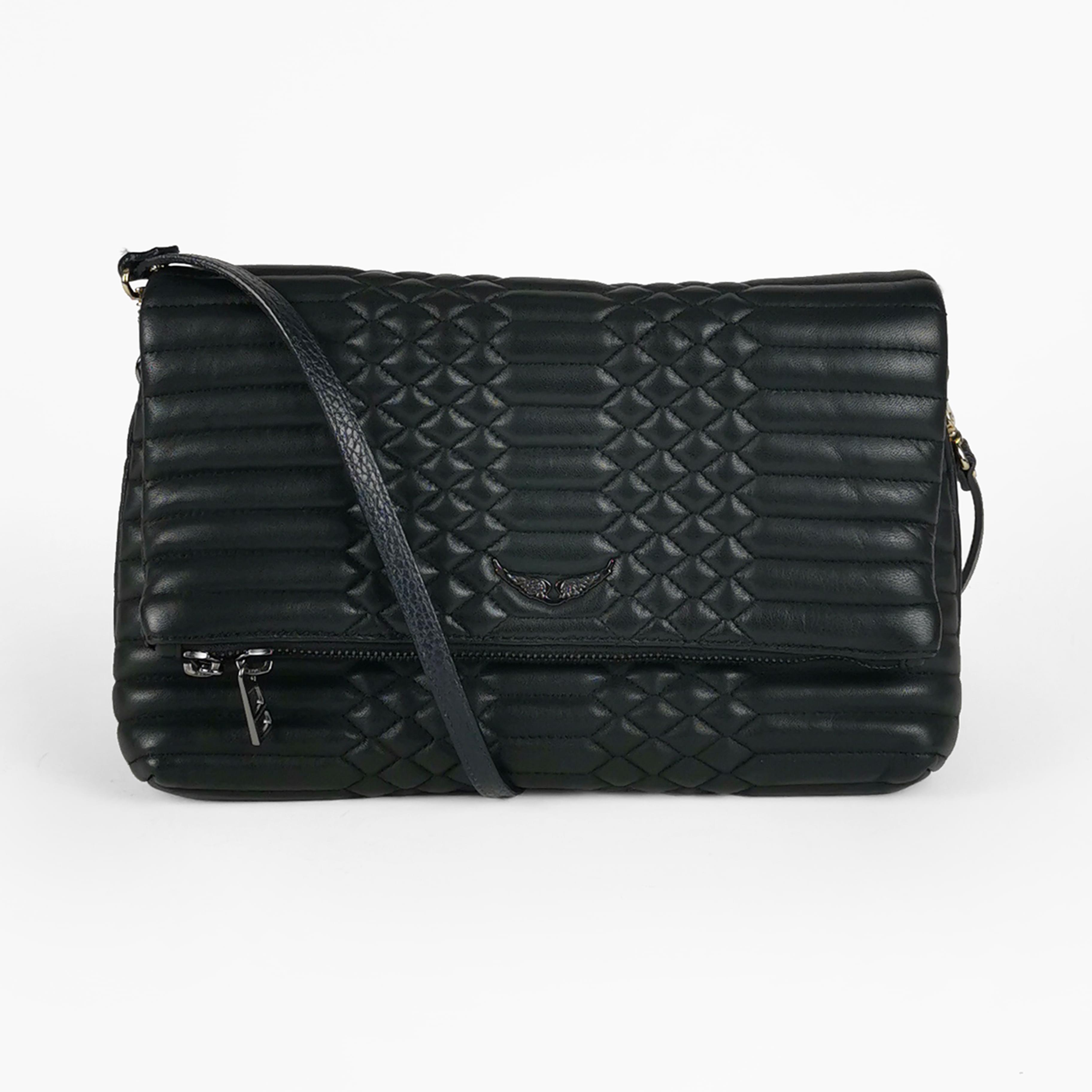Cuir matelassé noir, fermeture en rabat aimantée et zippée, intérieur noir en toile à deux soufflets avec une poche zippée, bandoulière en cuir ajustable et amovible, env. 19x27x11 cm