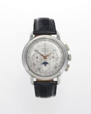 Cadran gris, chiffres romains et aiguilles argentés, mois, jour et date à guichet, phases de lune, bracelet croco noir, réf 14/01 0240 419, circa 1995, acier, D 40 mm, dans son écrin