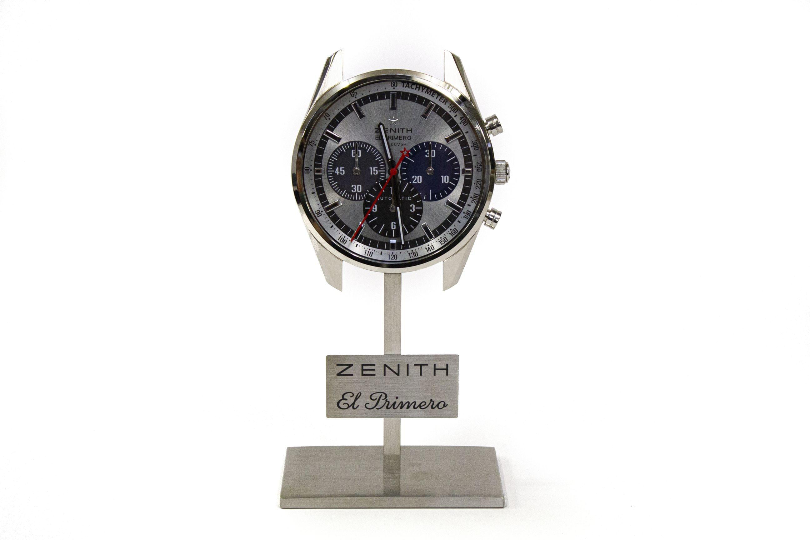 Cadran gris, aiguilles luminescentes argentées, trotteuse rouge, chiffres arabes blancs, acier, H 20 cm, dans sa boîte