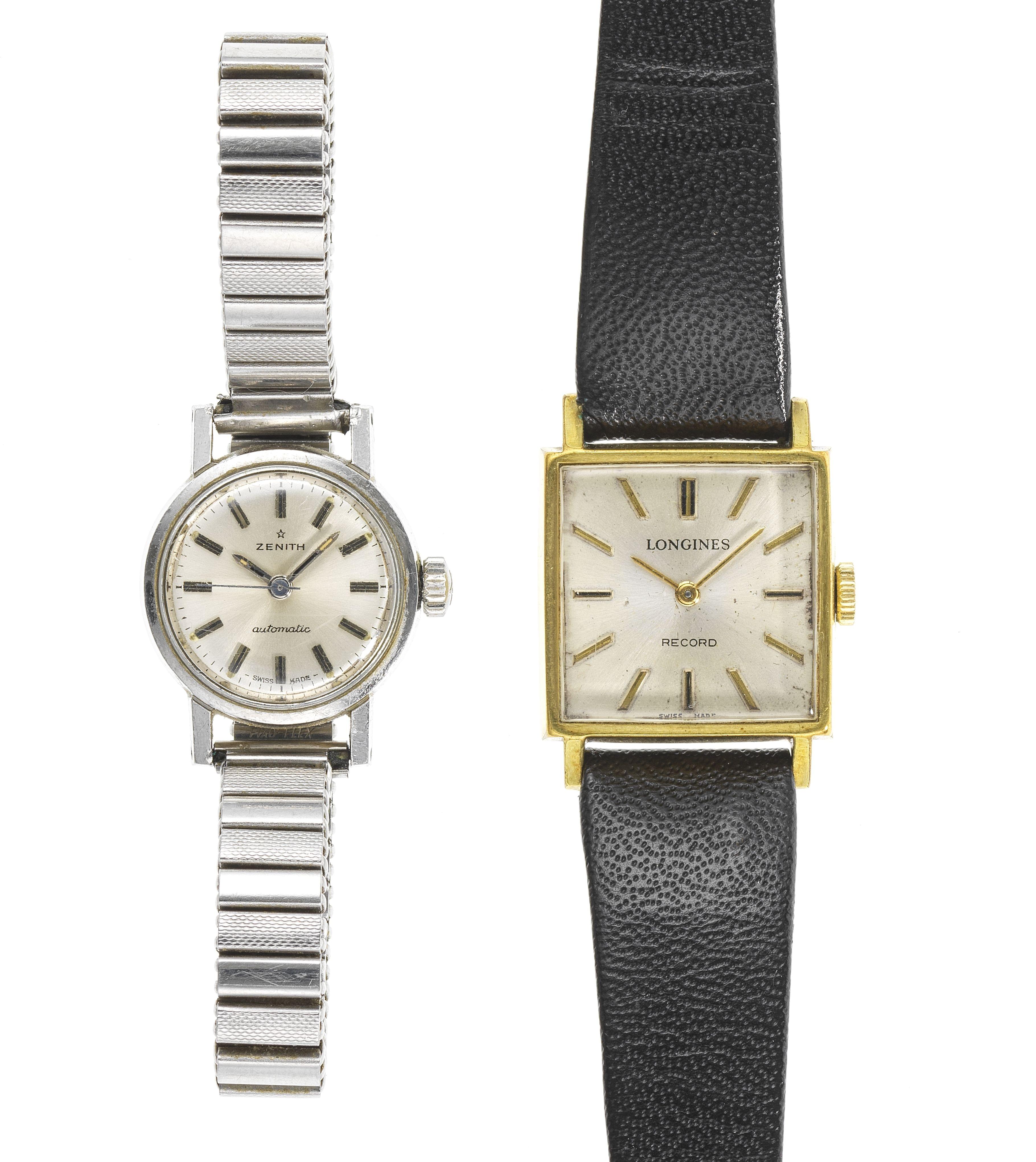 La première ronde automatique, cadran gris, aiguilles et index bâtons argentés, acier, D 19 mm, la seconde carrée mécanique, cadran gris, aiguilles et index bâtons dorés, métal doré, 21x21 mm