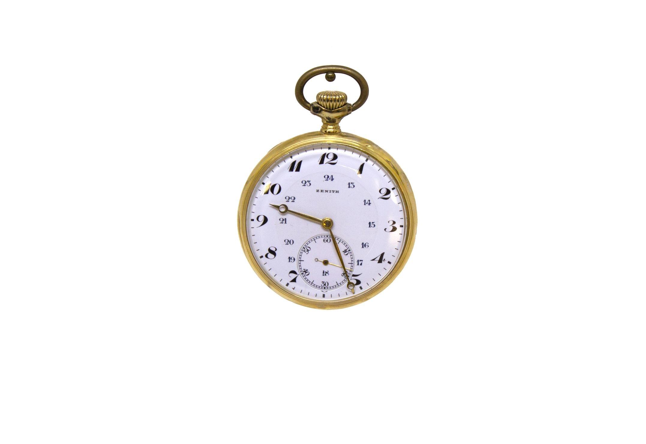 Cadran émaillé blanc, aiguilles dorées, chiffres arabes noirs, secondes à 6h, or 750, D 46 mm, poids brut 70 g