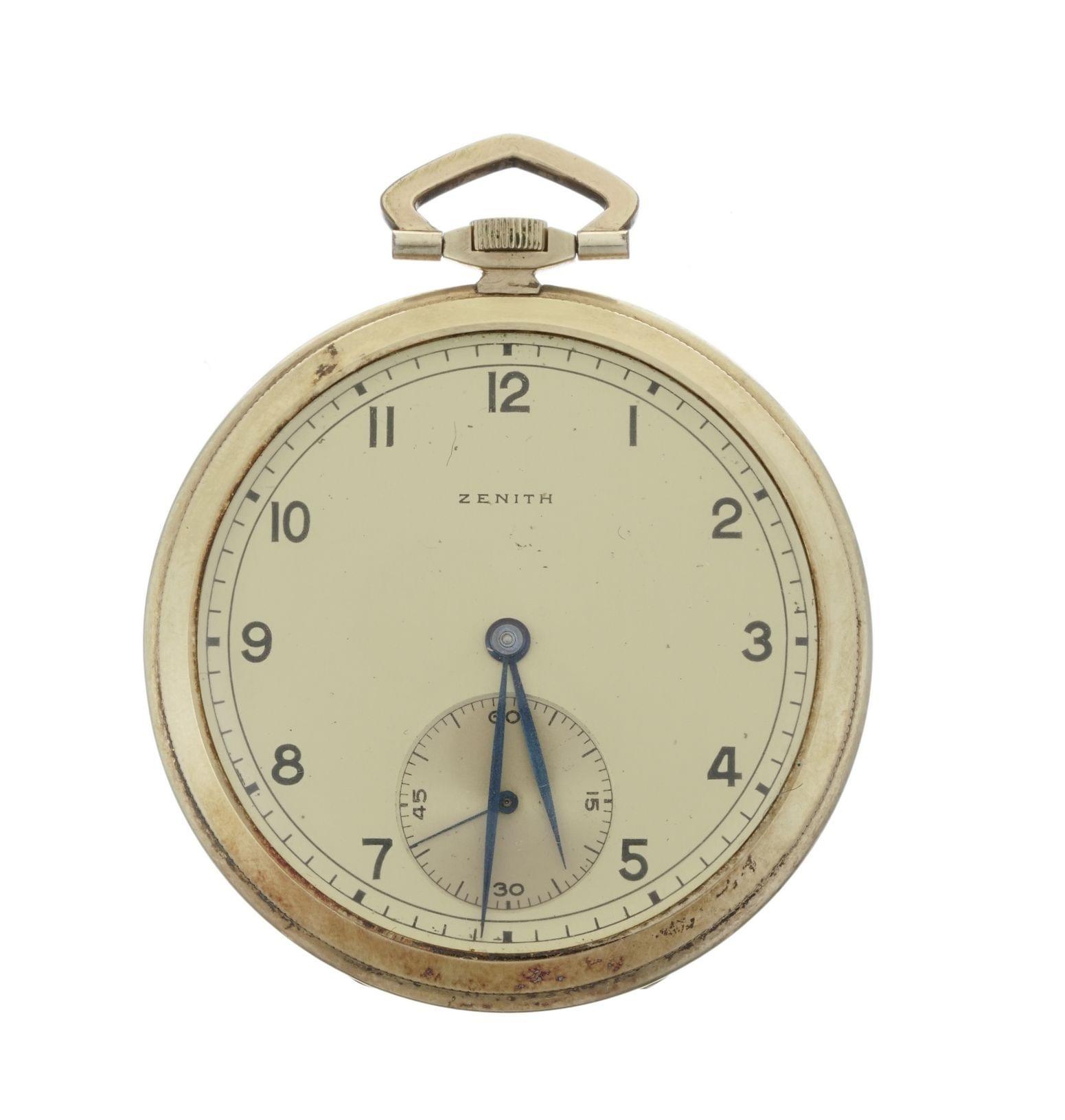 Cadran doré, aiguilles et chiffres arabes noirs, secondes à 6h,...