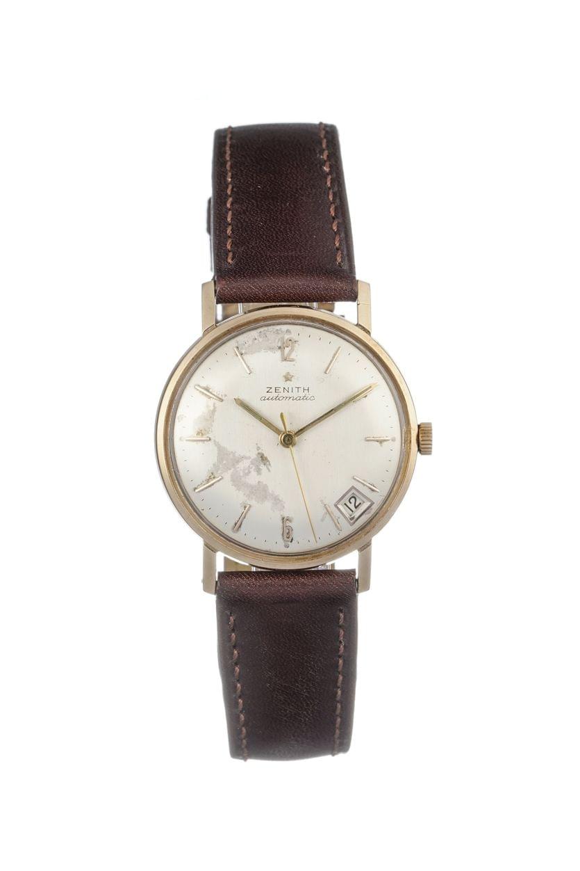 Cadran gris, aiguilles, index bâton et chiffres arabes dorés, date à guichet entre 4h et 5h, bracelet en cuir bordeaux, boitier en or 750, D 30 mm, poids brut 41 g