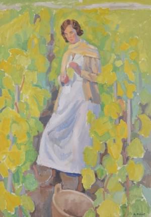 Jeune femme dans les vignes, huile sur toile, signée, 90x64 cm