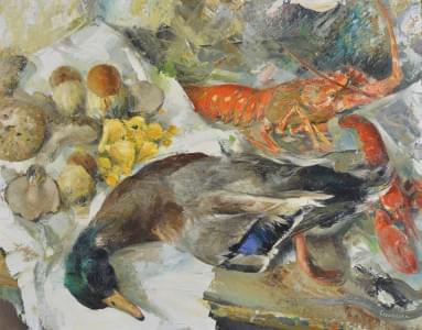 Nature morte au colver, huile sur panneau, signée, 72x92 cm