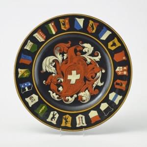Terre vernissée à décor incisé des drapeaux des cantons suisses,...