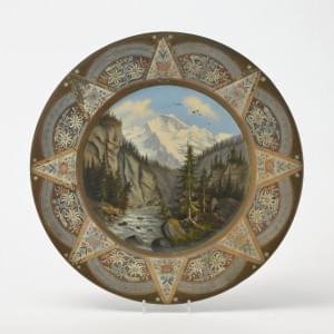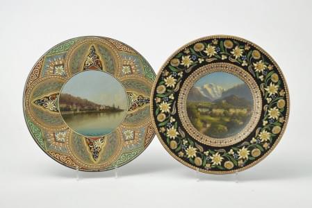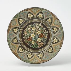 Terre vernissée à décor incisé de fleurs, centre peint de vues d...