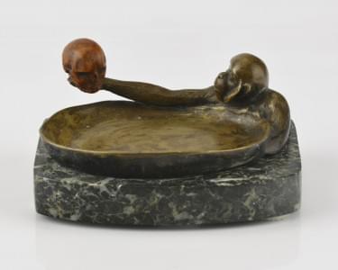 Figurant un singe tenant un crâne, bronze patiné et bois sculpté...