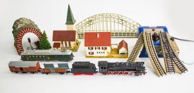 Train Marklin avec locomotive, wagons, rails et éléments de déco...