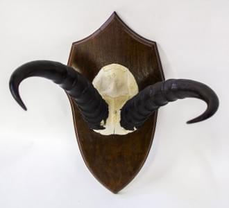 Trophée composé de deux canines, socle en bois noirci, D 17 cm