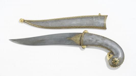 Lame damassée, poignée en forme de tête d'oiseau, métal argenté...